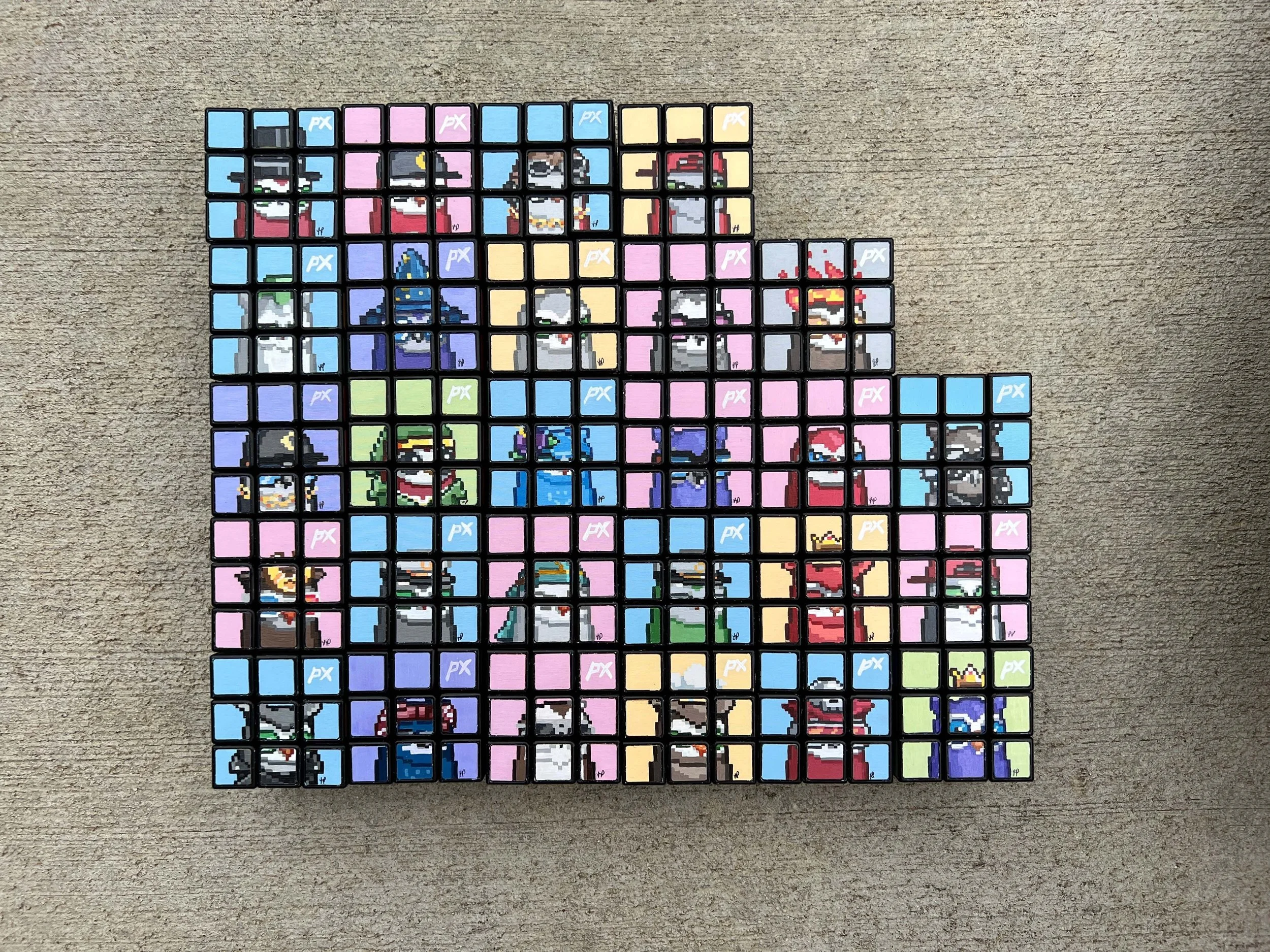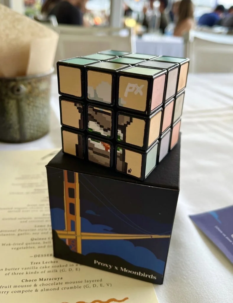 I painted custom Rubiks cubes for every person attending a crypto NFT meetup Proxy hosted recently. After looking up each person’s Moonbird, I then painted their NFT one face of the Rubiks cube. After the cubes were painted, they needed custom packaging to be handed out in. I designed custom stickers that I placed on boxes, placing a card on top of the wrapped cube. They turned out to be a great party gift and made a splash on twitter!