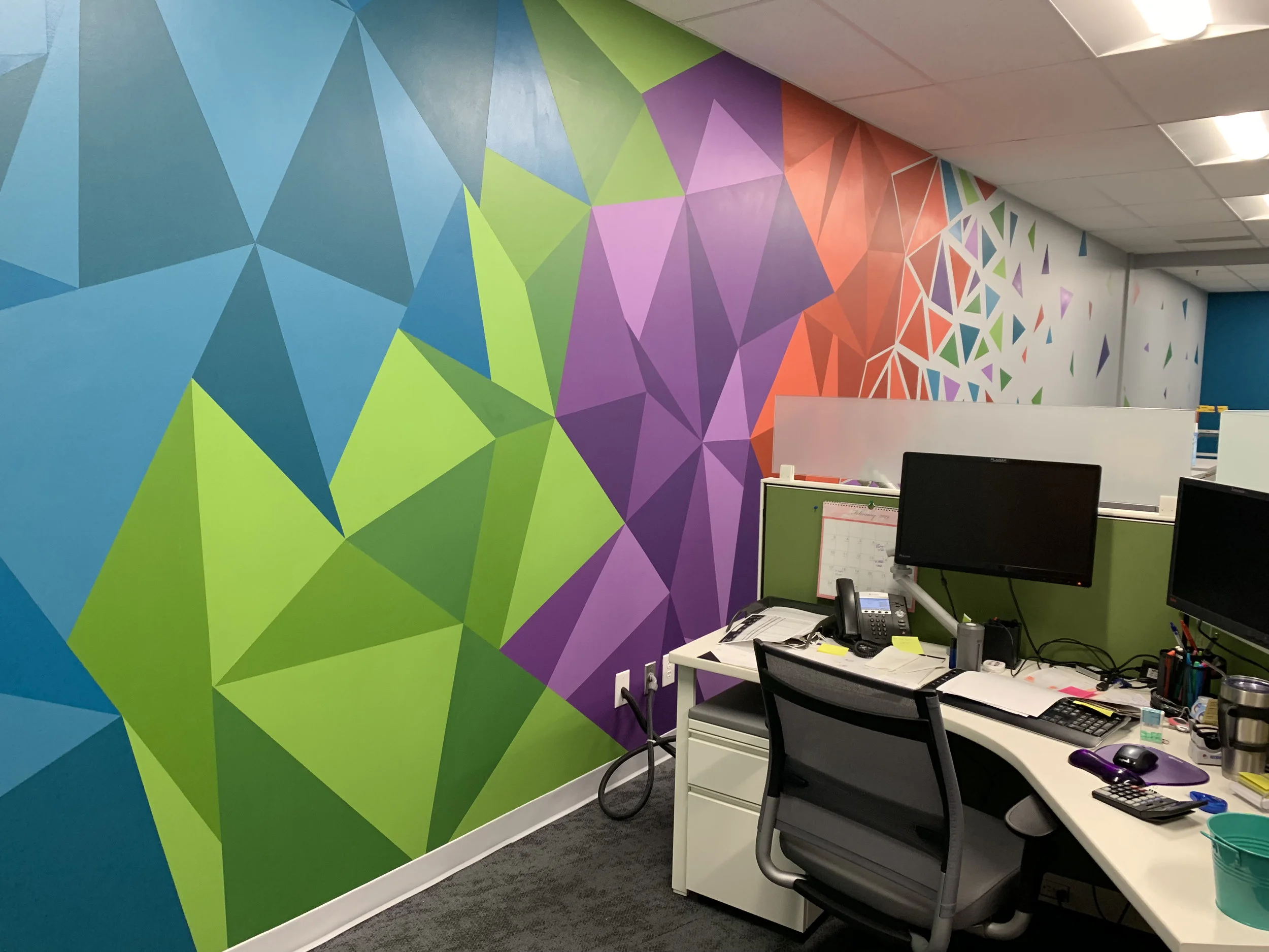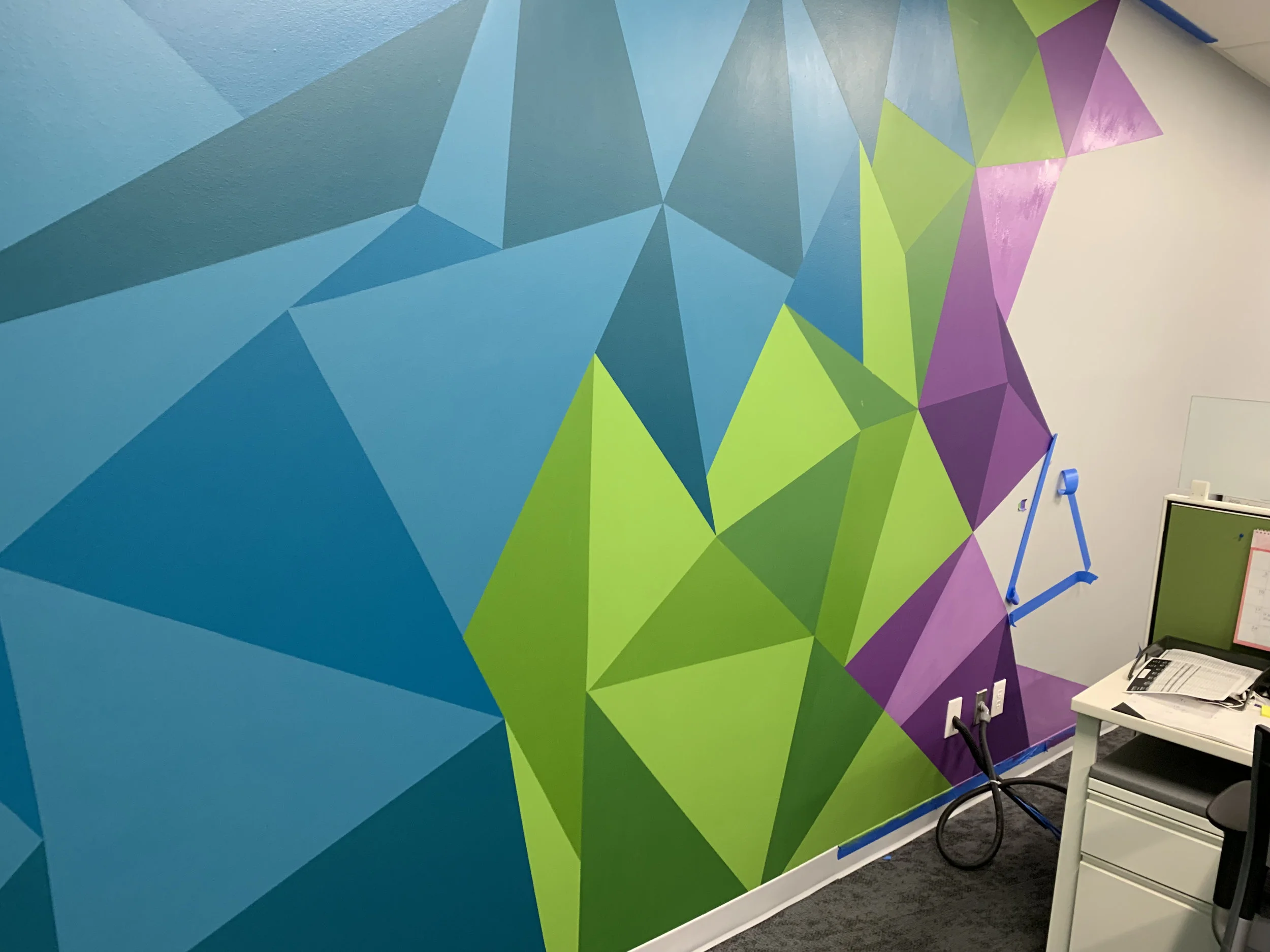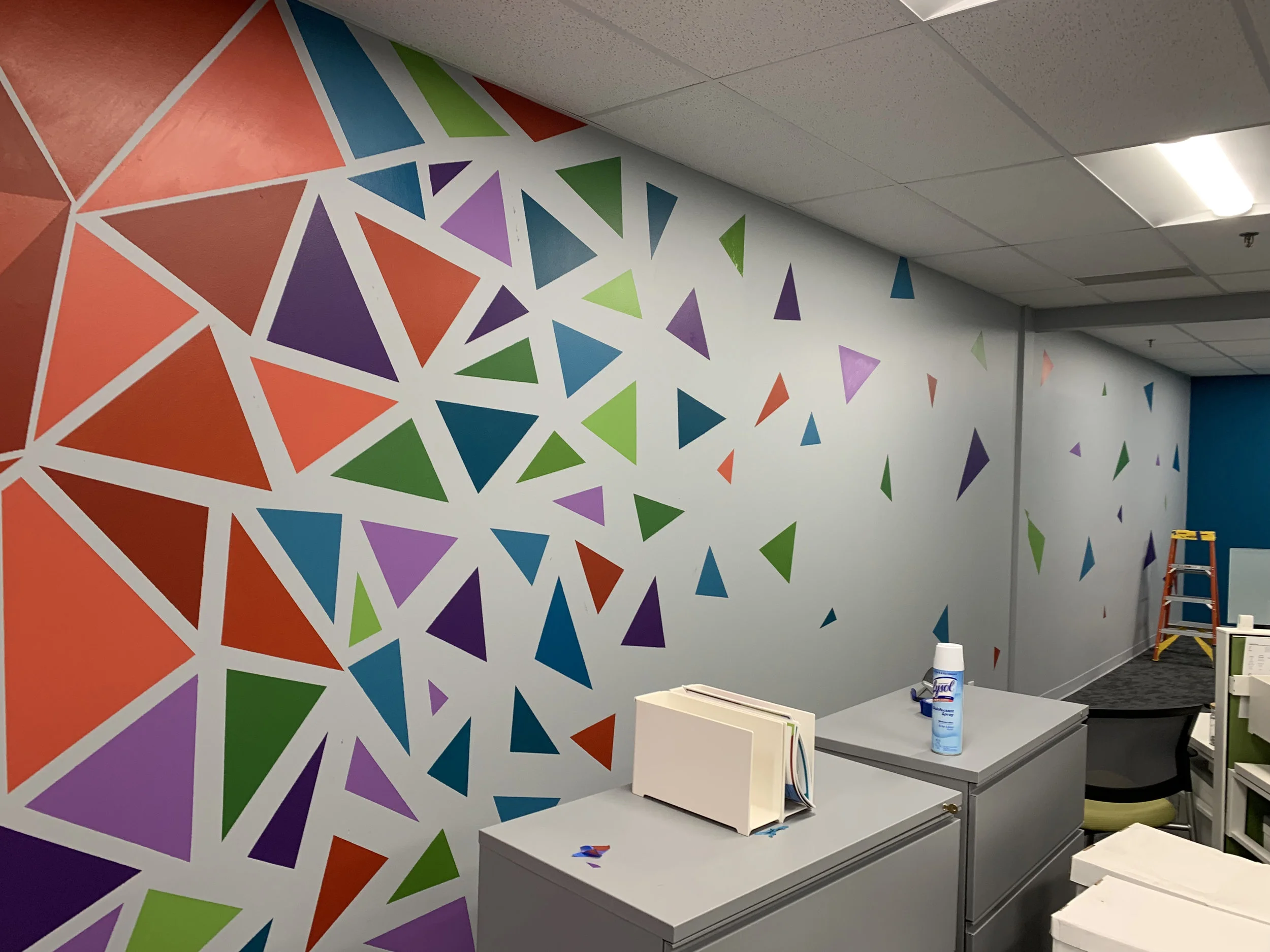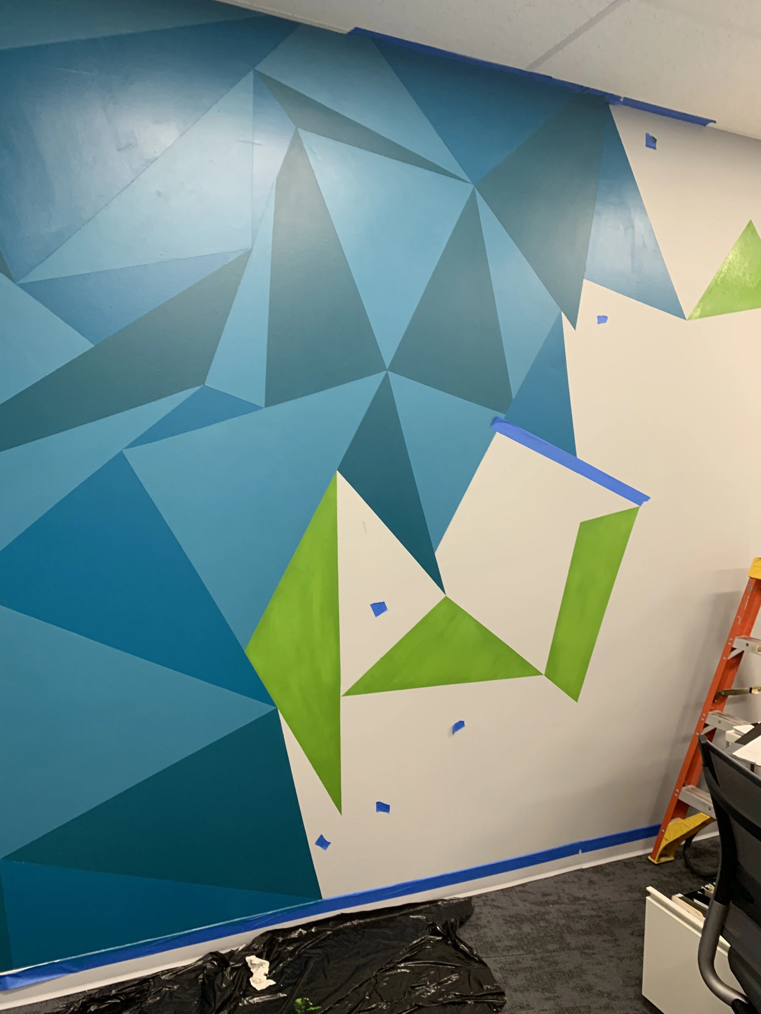 The mural is a series of triangles, matching the Morales branding. I used 4 different colors, each with 4 different shades to make the triangles out of. The wall is about 10 ft. tall and spands more than 50 ft. long.
